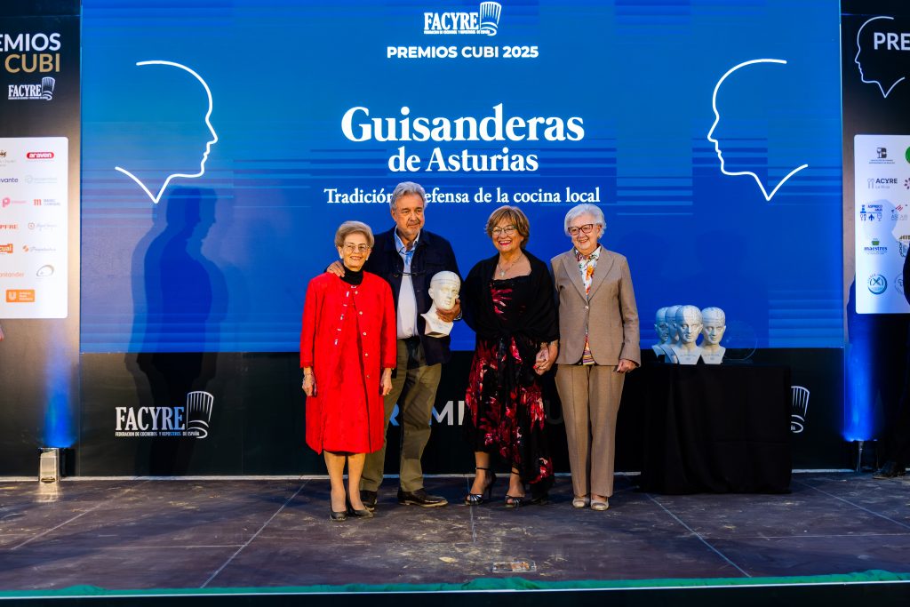Las Guisanderas de Asturias fueron reconocidas con el PREMIO CUBÍ 2025 A LA TRADICIÓN Y LA DEFENSA DE LA COCINA LOCAL. Juanjo López, chef propietario de La Tasquita de Enfrente fue el encargado de otorgar el galardón a Aída Rosales, Amada Álvarez y Argentina Peláez, guisanderas.