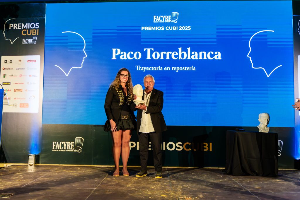 El maestro pastelero Paco Torreblanca ha sido reconocido en esta edición con el PREMIO CUBÍ 2025 A LA TRAYECTORIA EN REPOSTERÍA, gracias a una dilatada carrera profesional que ha llevado lo mejor de la pastelería española a todos los rincones del mundo. La vicepresidenta de ACYRE Madrid, Begoña García fue la encargada de otorgarle la distinción.