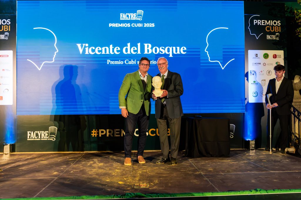 Por último, Vicente del Bosque, exfutbolista y entrenador de la selección española de fútbol entre 2008 y 2016, fue condecorado con el PREMIO CUBÍ 2025 SOLIDARIO. En este caso se lo entregó Juan Antonio Medina, chef y vocal de FACYRE.