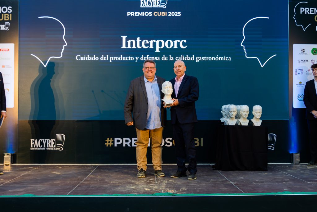 PREMIO CUBÍ 2025 AL CUIDADO DEL PRODUCTO Y DEFENSA DE LA CALIDAD GASTRONÓMICA recayó en Interpoc, Organización Interprofesional Agroalimentaria del Porcino de Capa Blanca, por su importante labor en el desarrollo del sector. Su director Alberto Herranz, recogió el premio entregado por José Luis Inarejos, chef y vicepresidente de FACYRE.