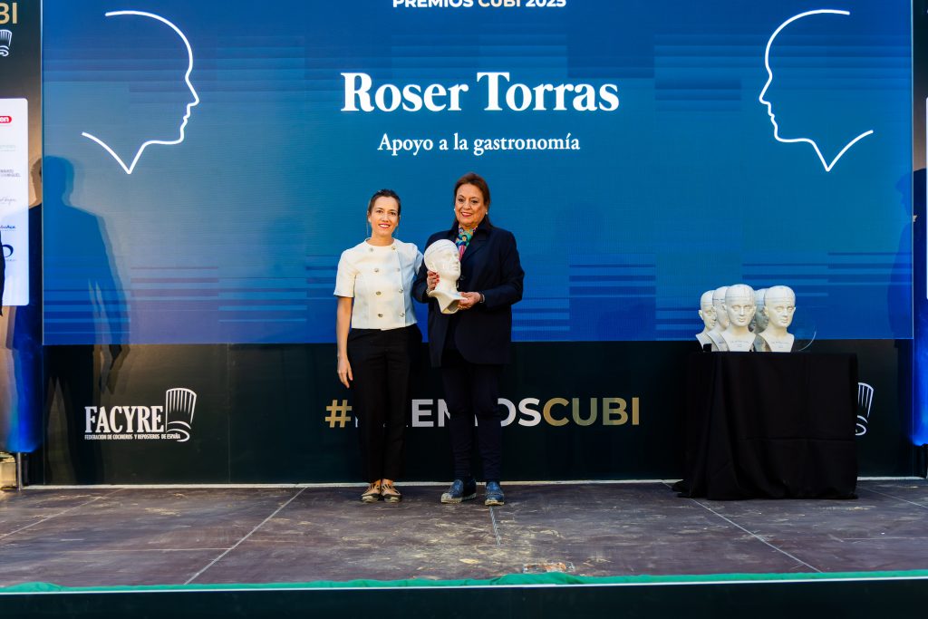 Roser Torras, fundadora de GSR y directora de San Sebastián Gastronomika fue condecorada con el PREMIO CUBÍ 2025 AL APOYO A LA GASTRONOMÍA de la mano de Xandra Luque, chef y vocal de FACYRE.