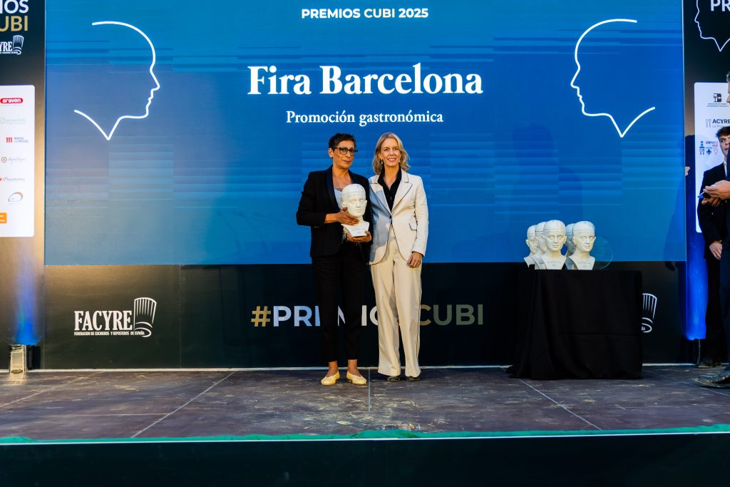 EL PREMIO CUBÍ 2025 A LA PROMOCIÓN GASTRONÓMICA ha recaído en la Fira Internacional de Barcelona, por ser uno de los mayores escaparates del sector tanto dentro como fuera de nuestras fronteras. Recibió el premio Ana Canal, directora de Alimentaria, de manos de Cristina Oria, fundadora del Grupo Cristina Oria.